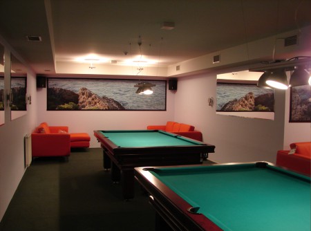 Viesnīcas restorāna grīdā ir iestrādātas mazas lampiņas, kas atspīd iestieptajos griestos kā spogulī un rodas iespaids, ka zvaigznes ir gan virs galvas, gan zem kājām, kā tas ir uz ūdens. Visā viesnīcas interjerā ir izmantotas jūras fotogrāfijas, biljarda zālē cokolstāvā ir jūras krasts zaļganos toņos, kas kontrastē ar koši sarkanajiem dīvāniņiem. Saunas un džakuzi telpā ir iestieptie griesti zilganzaļā tonī, lai radītu ūdens iespaidu un paplašinātu telpu. Uz sienām izdrukas, kas atgādina koraļļu rifus. Katra stāva toņu gamma atvasināta no kādas fotogrāfijas par jūras tēmu. 2.stāvs ir zaļganos toņos, trešais ir oranžīgs, bet ceturtais ir smilšukrāsas toņos. Lukss numuros ir gaišas mēbeles ar brūnām melnbaltajā fotogrāfijām. Visi apdares materiāli, paklājs, flīzes, linolejs piemeklēti šajā gammā. Tā kā ceturtais stāvs ir pārsvarā ar lukss numuriem, tad tajā ir sienas gleznojums un skulptūras par jūras tematiku. 4.stavā ir arī Sky bārs ar skulptūrām un keramiskām vāzēm ar koraļļu motīviem. Atsevišķi no restorāna ir ieeja konferenču zālē, kas ir veidota ar senatnīgām koka sijām un vecās Liepājas fotografijām. Lai iegūtu vairāk gaismas griestos starp sijām ir nostiepts no augšas izgaismots gaismascaurlaidīgs audums, kas rada iespaidu par gaismas logiem. Viesnīcas interjera projekts un celtniecības darbi veikti laikā no 2006. gada aprīļa līdz 2007. gada martam. Viesnīcas interjera dizaina projekta autore Ilze Tola. Arhitekte Diāna Zalāne. |