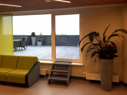 Biroja koncepts bija ienest dabu telpās. Lasīt talāk>> Auksto un pelēko stikla būvi padarīt mājīgu, zaļu un videi draudzīgu. Tāpēc arī interjerā izmantota pavasarīgi zaļā krāsa, saulespuķu dzeltenais tonis un rudzupuķu zilais, daudz telpaugu un dabīga koka detaļas biroja griestu risinājumā. Birojā strādā daudz darbinieku un darba ritms ir saspringts, tāpēc domāts par atpūtas zonas iekārtojumu. Tur ir ērti dīvāniņi ar TV ekrāniem, plaša terase ar skatu uz apkārtni, iespējas uzspēlēt galda tenisu un citas iespējas uz brīdi relaksēties, atpūsties un baudīt svaigi spiestu sulu vai kafiju un uzkodas.